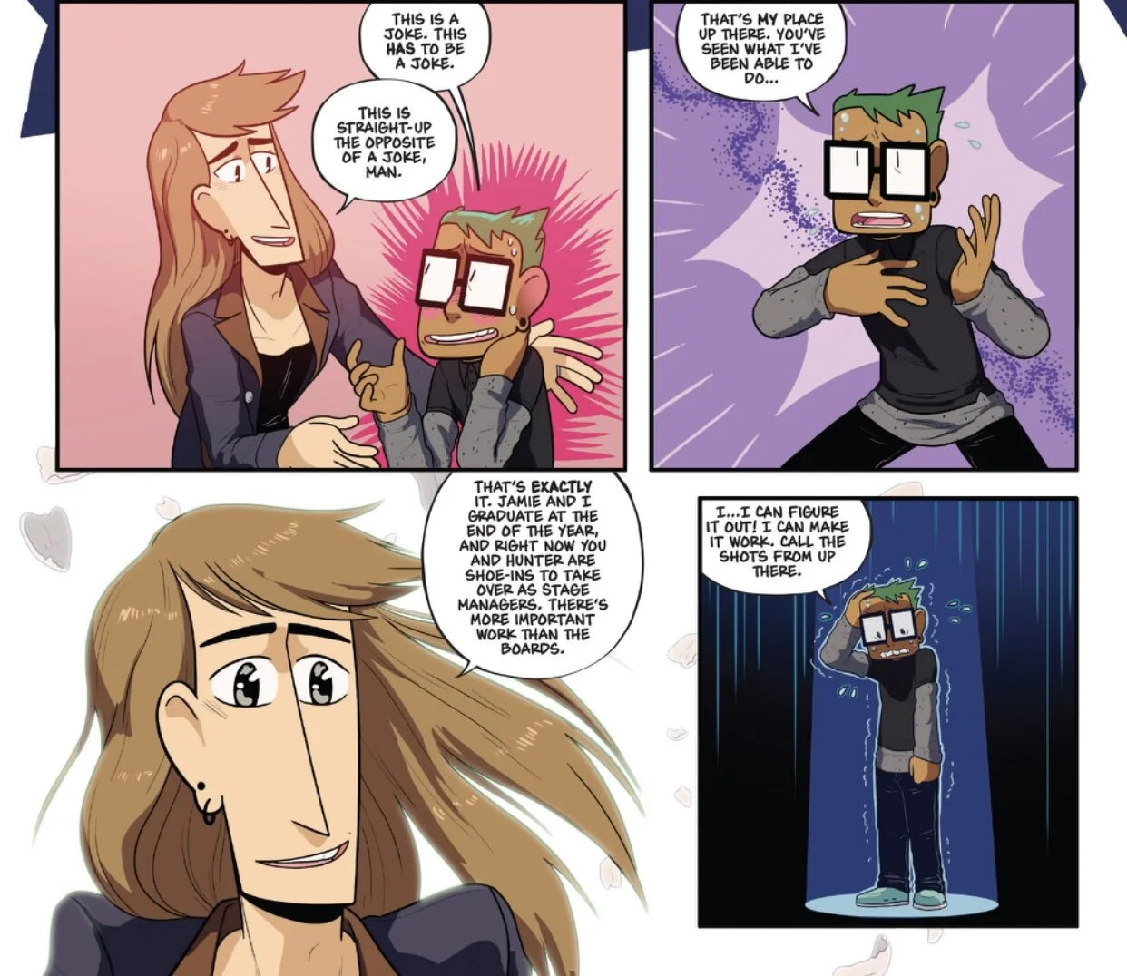 The Backstagers is a story all about spaces and their significance, especially in the way it depicts how a commonly overseen space like the back stage is actually infinitely more interesting than the stage itself. It’s not just because of the magical otherworldly dimension that the back stage leads to though; it is mostly because of what the space means to a group of misfit teenagers. While it is a cliché to say that teenagers are fixated on their rooms, the fact of the matter is that it is generally the one space that you have agency over during that time, which begins to explain why Beckett is so protective of his booth. Like he said, it’s the only space that he’s ever been able to make his own through his own agency. Also, the booth allows him to exert his agency on the shows thus giving him a purpose. Without lighting, there would be no show. On the other hand, however, the booth has entrenched Beckett in a comfort zone. Tim’s desire for him to take over as stage manager next year then becomes a very real threat to the space that has validated Beckett so much.