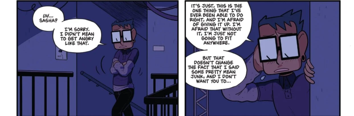 That is ultimately the reason why Beckett is so protective: a threat to his space is inherently a threat to his selfhood. After blowing up at Sasha for recklessly playing with the lights, Beckett allows himself to be more vulnerable and admit that he knows he is acting out of fear. This is the one area he excels in, and having to teach Sasha opens the possibility of Sasha’s work reflecting poorly back on him. Additionally, Tim’s wish for him to step away from the booth into full stage managing opens the possibility of failure because, if you stick to what you know and never try anything new, you can never fail, right? While spaces can provide safety and comfort, in terms of characterization and overall growth, being ascribed to a specific space is also a sign of stagnation. Being a little older, Tim knows this, and he believes that Beckett has what it takes to do more.