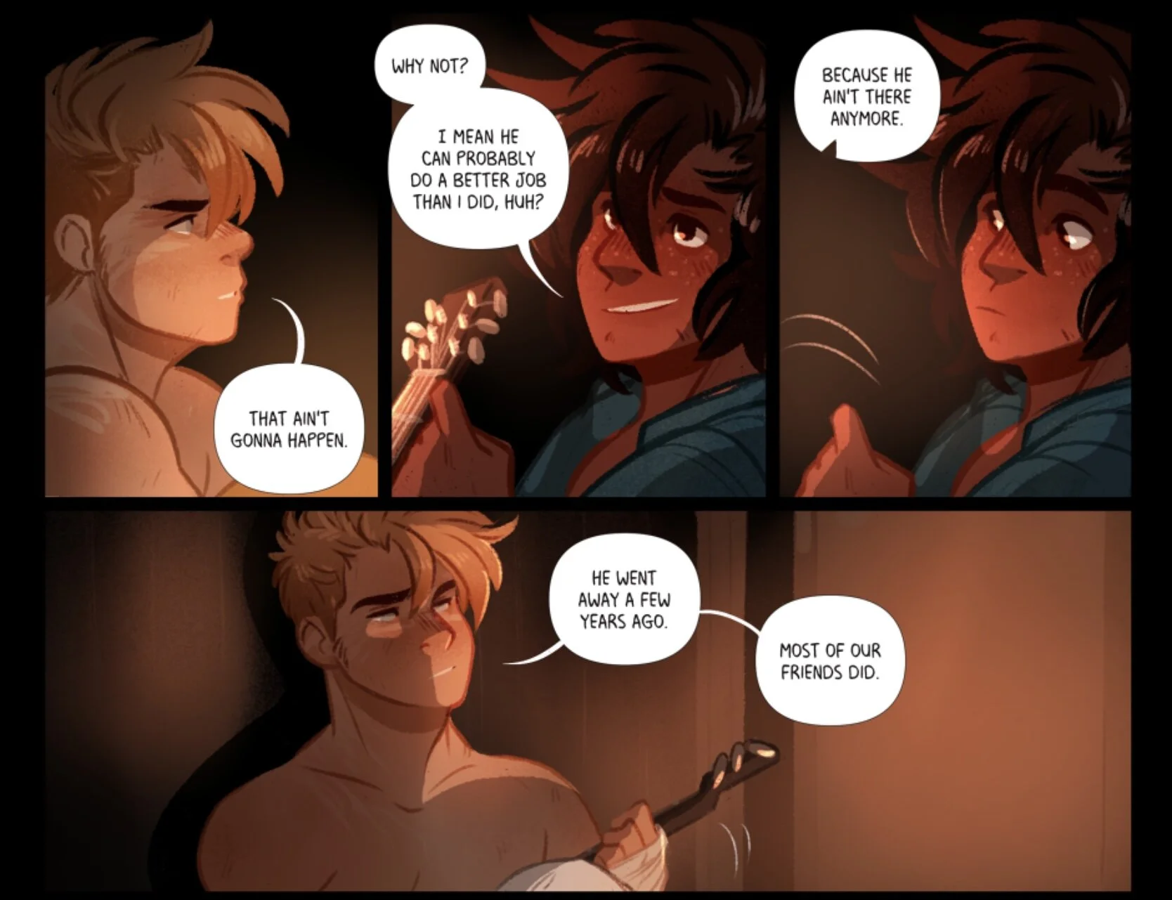 Third panel: A shot of Mack and Felix from behind. Felix’s left arm is around Mack’s as they keep playing the guitar together.