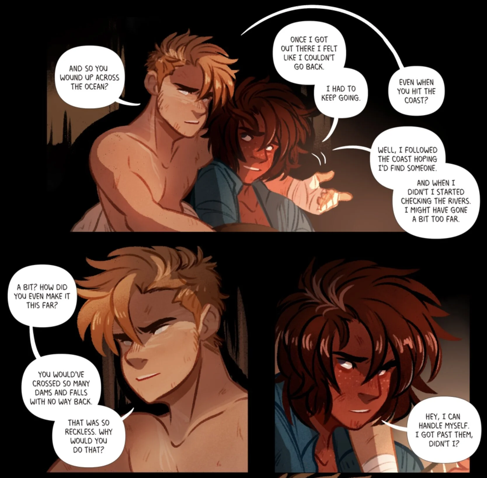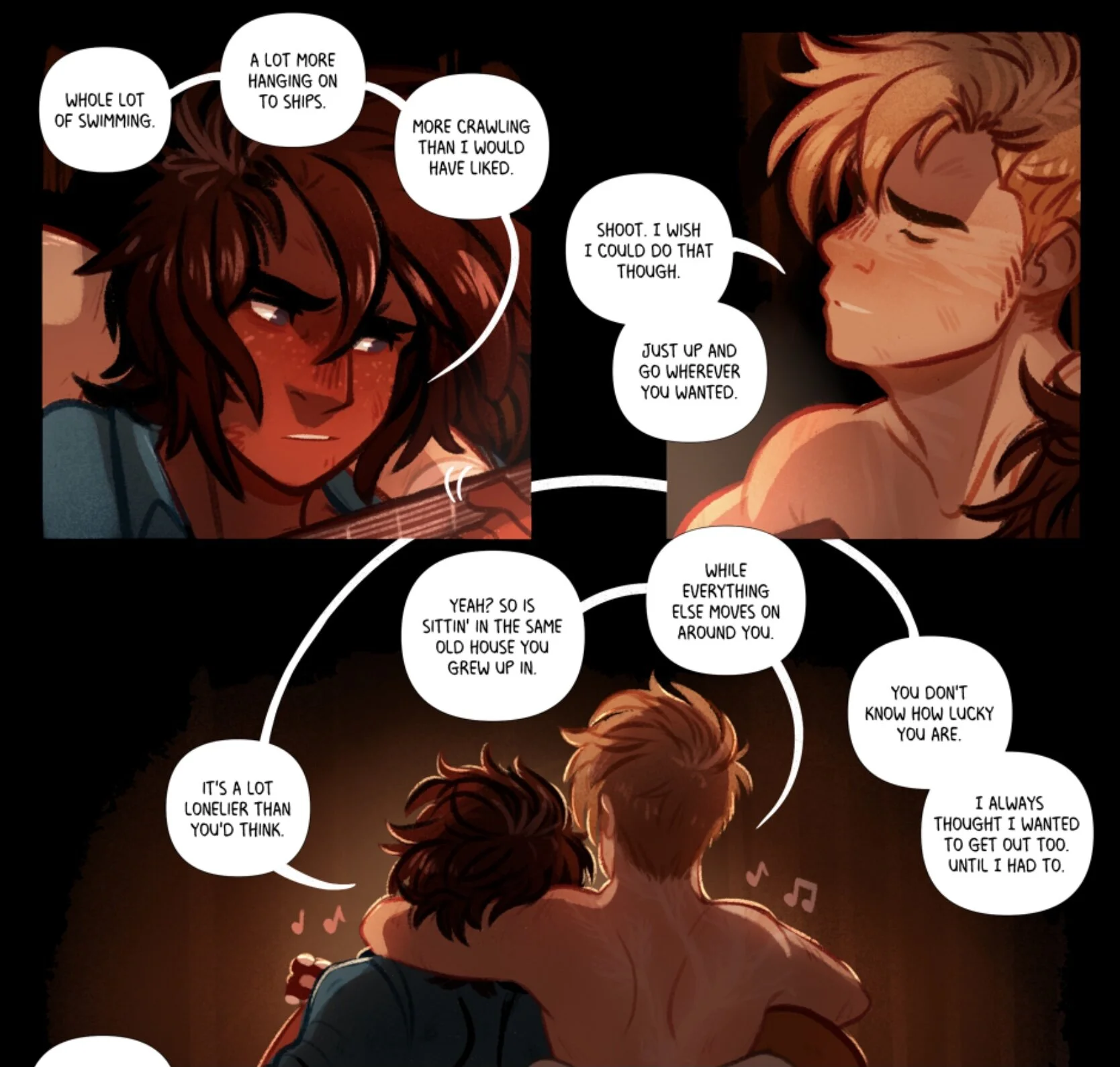 Now, the visuals create a very sharp contrast with the stories at hand. As Felix and Mack open up more and more about how lonely they have felt, they slowly end up in each others’ arms. This is particularly poignant as this is the first time in the story where they deliberately come close to one another. There had been some contact before: Mack grabbed Felix to pull him into the water in the beginning, and when the dam broke, Mack held on to Felix to save him. It’s interesting to notice that Mack had always been the one to reach out, but at this point Felix is the one that told Mack to come closer. Regardless of the circumstances that lead to their isolation, both characters are incredibly lonely and yearning for affectionate contact. Their worlds are vastly different, and they might struggle to understand the other’s choices, but their loneliness is the same. Being left behind by men they both cared for and feeling stuck or aimless because of it are tropes that resonate with queer readers, and Felix and Mack’s heart-to-heart is a good example of how while the may details vary, the feelings are ultimately the same.